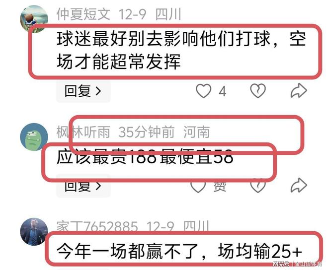 用“全華班”去打別人4節(jié)7人次外援球隊(duì),票價(jià)還不愿意“跳水”,球迷們也是怨聲載道,紛紛吐槽道“免費(fèi)請(qǐng)我看都不看,讓這些人自娛自樂吧”;“球迷最好別去影響他們打球,空?qǐng)霾拍艹0l(fā)揮”;“應(yīng)該最貴188 最便宜58”;“今年一場都贏不了,場均輸25+”;“免費(fèi)都不得去,沒有意思”……