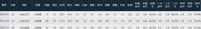 上賽季,曾凡博迎來了質(zhì)的飛躍,常規(guī)賽場均14.7分4.7板1.9助1.5斷,場均以40.5%命中率扔進(jìn)2記三分球;季后賽場均15分4.2板1助1斷1.6帽,場均以43.3%命中率扔進(jìn)2.6記三分球。