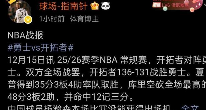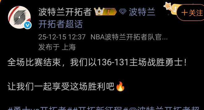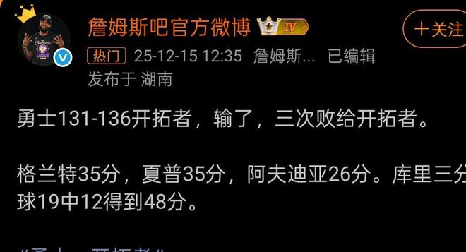 詹姆斯吧官方微博(勇士131-136開(kāi)拓者,輸了,三次敗給開(kāi)拓者。2025.12.15)