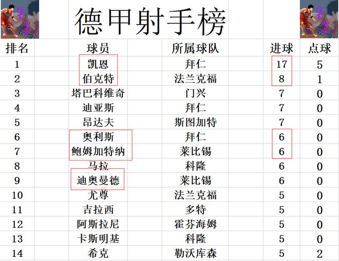 射手榜方面,凱恩上演帽子戲法,讓德甲金靴越來越?jīng)]有懸念,凱恩已經(jīng)比第2的伯克特多了一倍還有剩的。迪亞斯,塔巴科維奇和昂達夫7球并列第3,迪奧曼德帽子戲法,鮑姆加特納傳射建功,兩人追上奧利斯,馬拉,6球并列第6。